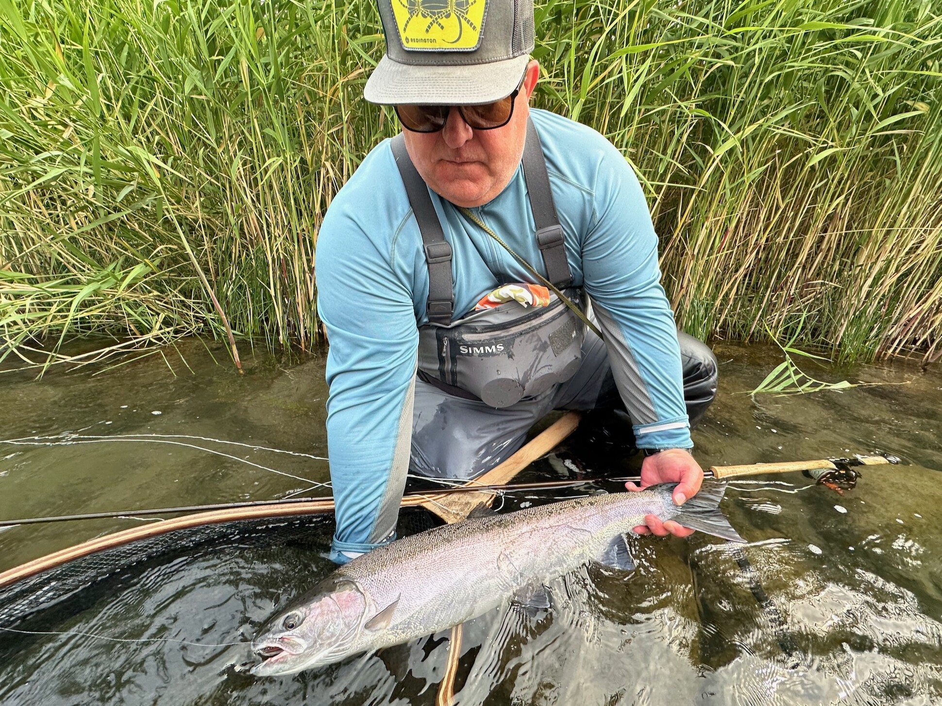 Once out of the boat, Josh pointed me up the river, just above a flat rock, which sat in front of some green vegetation around a burnt snag that jutted out over the river. Once there, I stepped gingerly in the river; I picked a place to start my swing. Once I reached my optimal casting distance, I started my descent downriver. Sometime later, during my descent, I felt a jarring grab to the size 4 sprout down-eye hook. After a series of heavy head shakes, I saw the heavy boil of water and grasped the cork handle to hold up the heavy bend of my rod tip. "Whooooooooo!" I screamed. I heard my mates echo in the distance, "You got a fish"? I did have a Deschutes Summer Steelhead attached to the drab "Chaveney"--the weakling and afterthought fly from a litter of others. Once again, I thought, "Could this be a confidence steelhead hair wing pattern–I had heard of so many times over." The graceful dance of the Native Hen made my line taught and my reel spooled forward freely.