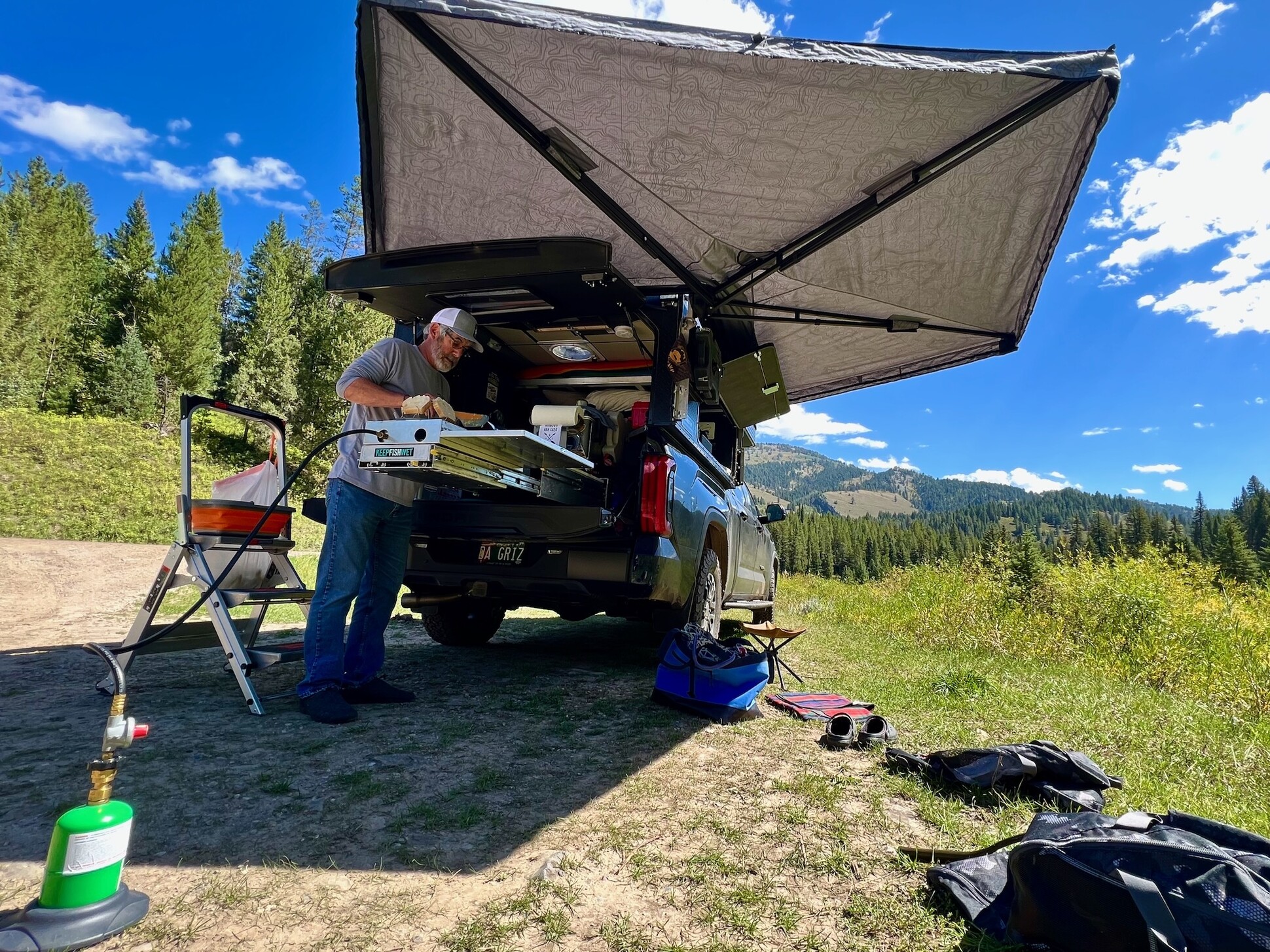 Addressing the camping part of the rig has been fun. I added a roof rack on the camper to hold our River Quiver and a 100-watt solar panel, adding to the power supply and rod-carrying capacity. I also bolted on a 270 awning, the "Major Shady" from Yakima, and a shower stall from Joolca. Then, a diesel heater to make colder nights more comfortable. Like I said earlier, why not?