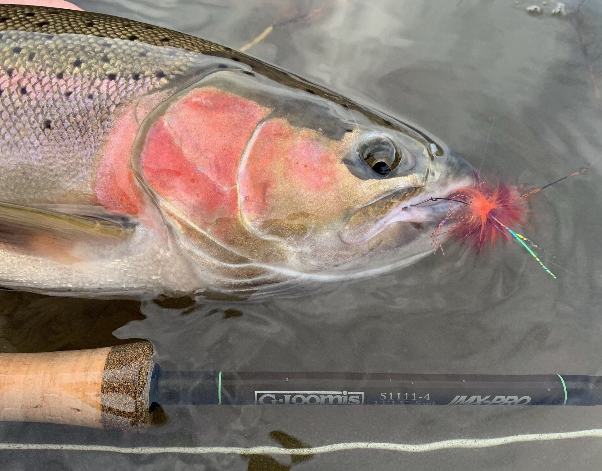 We kept going with our hopes high, hitting our favorite spots. This time of year, on these smaller rivers, we typically fish short sink tips like the RIO MOW 5x5 and the 2.5x7.5 with a smallish fly like the Klamath Intruder. These shorter sink tips don’t fish very deep, and the floating portion really helps to grab what little current there is.