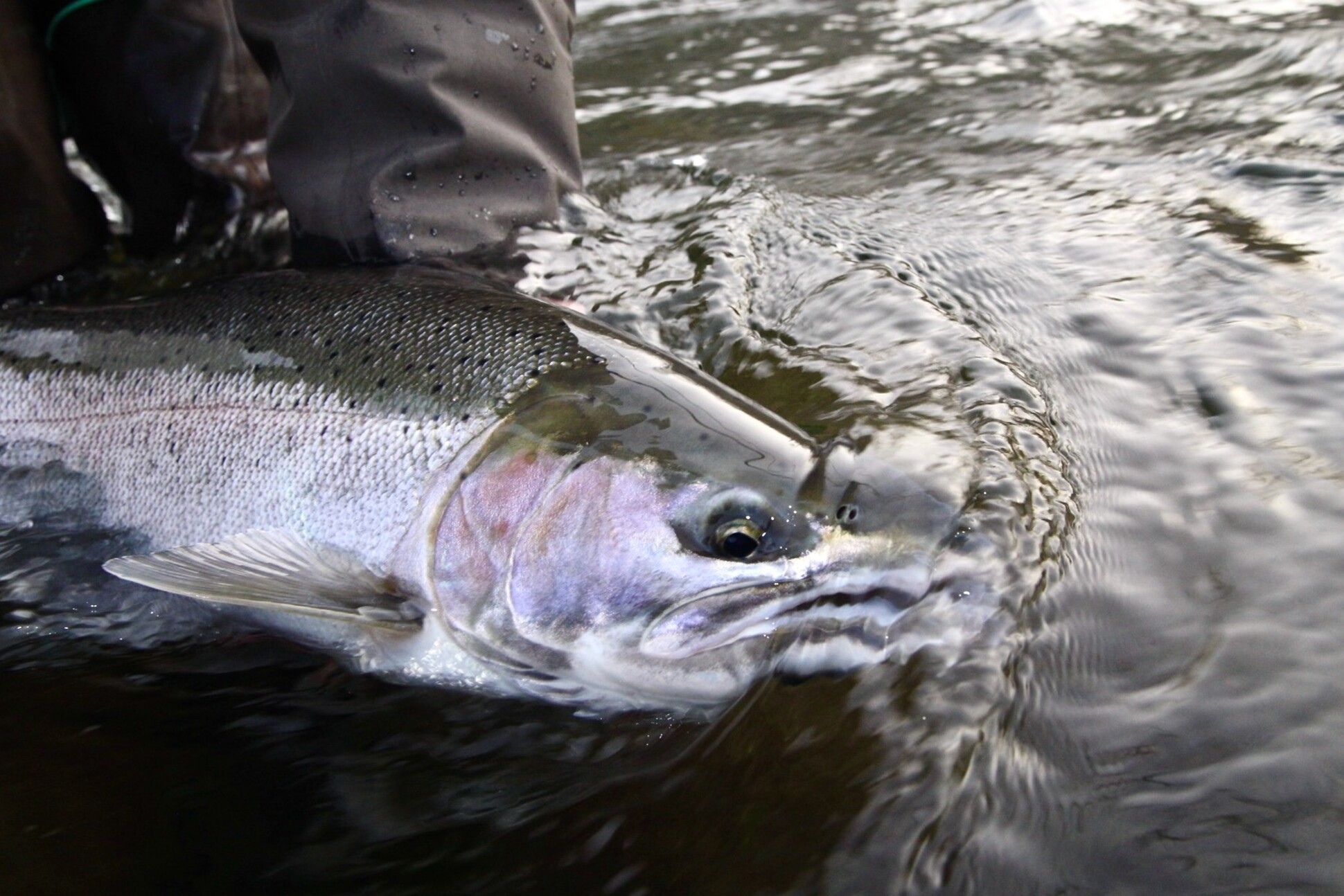 While high, off-colored water is not the most productive; one can still find fish using the proper techniques. Contrary to a popular misconception, high-water conditions don't require fast sink-tips and heavy flies for success. When the river is up and filling its banks, fish are pushed to the sidelines and seams out of the main turbulent flow. You'll hang up every time if you try to chuck your chunk of T-14 and heavy fly out to swing into the closer holding spots. Loop on a slower sinking tip and focus on fishing in close with a fly the fish can see. In cloudy water, darker flies show up better. This is a great time to double-stack simple marabou tube flies, a bigger profile that won't hang up as it moves closer to shore.