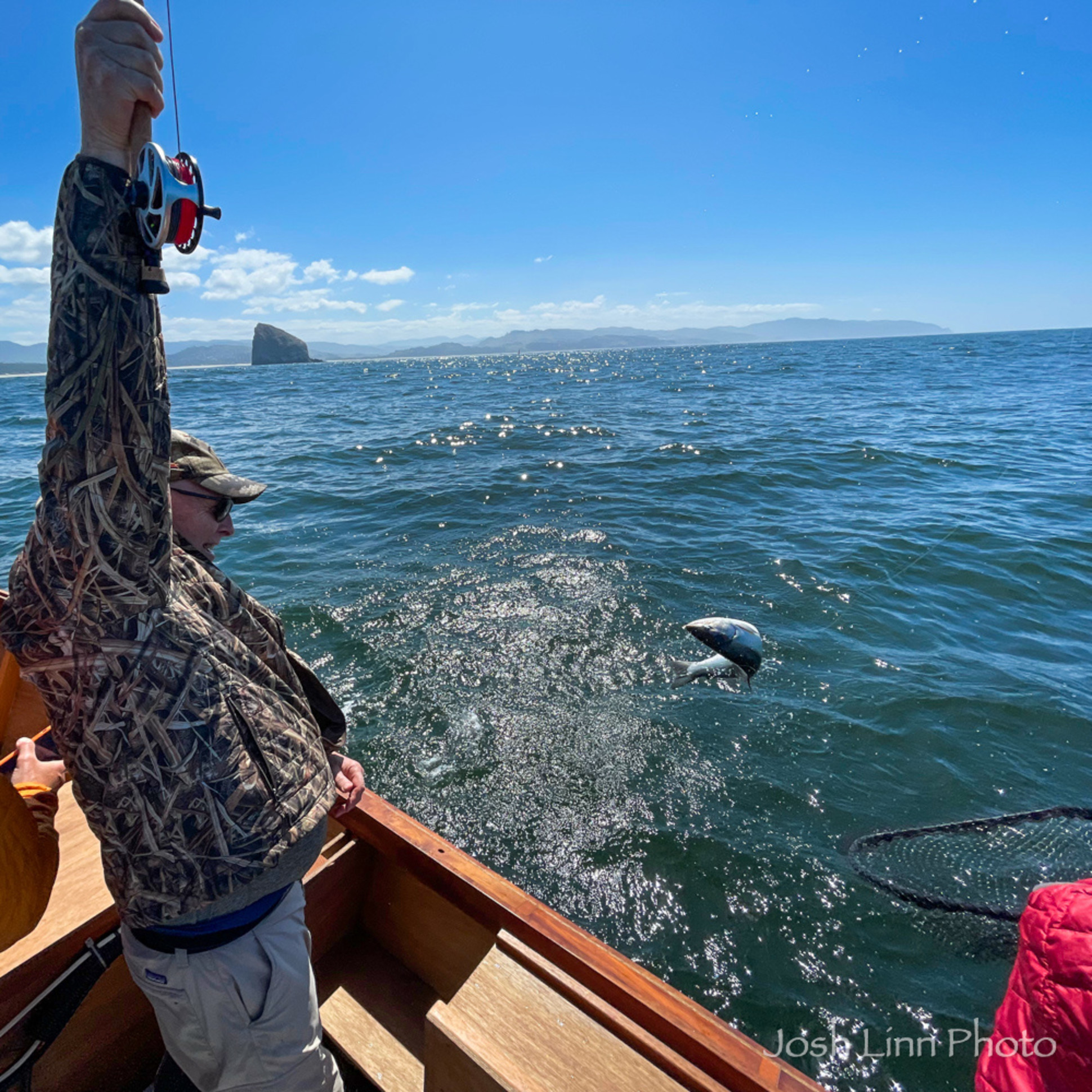 Leaving the beach and heading out through the breakers is an experience. Rob's professionalism, experience, and knowledge shine, making this passage safe and exhilarating. Splitting Cape Kiwanda and Haystack Rock we made a 3 mile run out to the fishing grounds. Rob spotted a tidal rip, always a good place to find baitfish piled up and ripe for the taking.