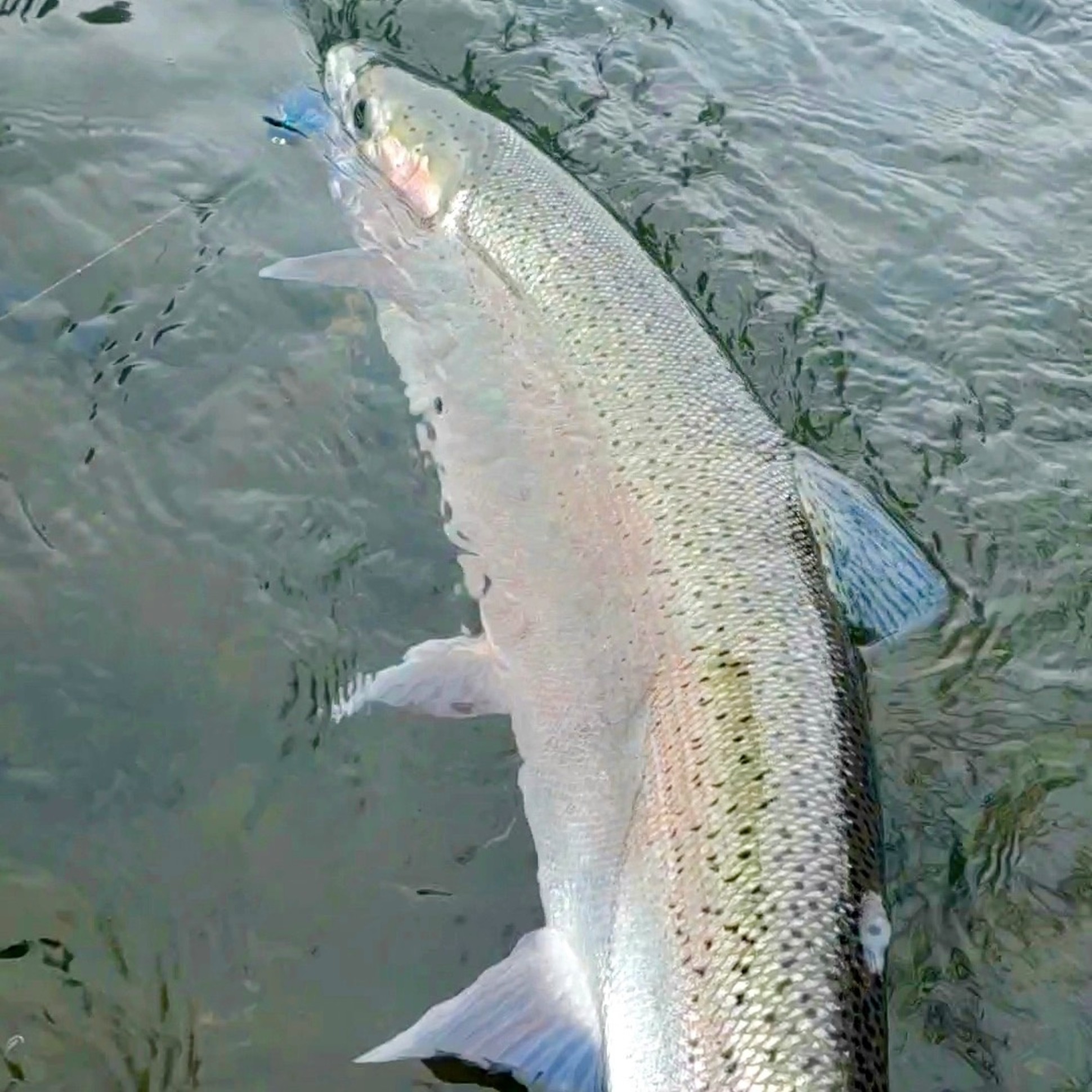 Anyways, I tie on this lucky blue fly and start swinging and stepping. I haven’t made many casts before I have company below me, the latecomer. Fortunately, they need to rig up. A couple more casts and there it is. The beautiful click of my Perfect as a fish takes. I let the fish take line until it doesn’t, and I start reeling. I see a dark shape in the air and a splash. Late Comer is suddenly curious and watching from downstream. The fish and I keep dancing and I realize it isn’t coming as high as me, so I keep reeling and working my way down. Another shorter run, then it ran into the bank. I’m thinking maybe it’s a big sucker, this is weird. I finally get down to slower water and the fish isn’t ready yet, but I can see it’s a nice steelie. I get to a good spot and tail the fish. Right there in the corner, was blue. Then I realized that I’d forgotten my hemostats. Dammit. More rust falls.