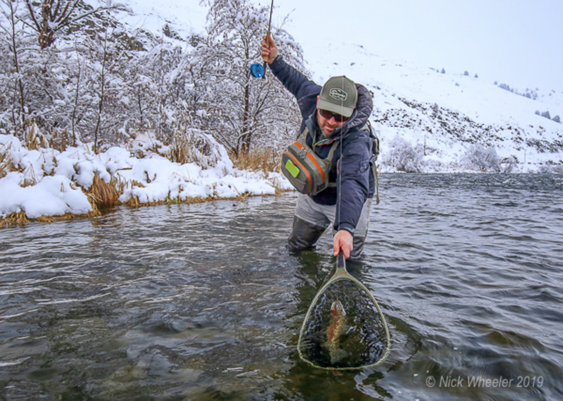 For the tippet we suggest using fluorocarbon tippet, 5x is a good starting point. The thinner tippet sinks faster and is more invisible. The tippet section consists of two pieces of tippet tied together with a triple surgeons knot. The first section of tippet is blood knotted to the tippet ring and is usually between 3’-5’. We adjust the length of tippet depending on the river we are fishing or how deep we are trying to get. On the lower part of the Metolius, we typically fish a longer top tippet section around 5’. On the Deschutes, we are often fishing a piece that is 4’ long. And on the Crooked, we are fishing around 3’. Use a triple surgeon’s knot to attach the second piece of tippet approximately 26” long for your point fly. We have noticed with the longer spacing between flies you end up getting more doubles, literally a fish hooked on each fly. After we connect the two pieces of tippet we leave the tag that is facing down around 6”-8” long so we can attach our dropper fly. We trim the tag that is pointing up the leader system. The heavier point fly goes on the bottom, and the lighter dropper fly goes on the 6” tag up above.