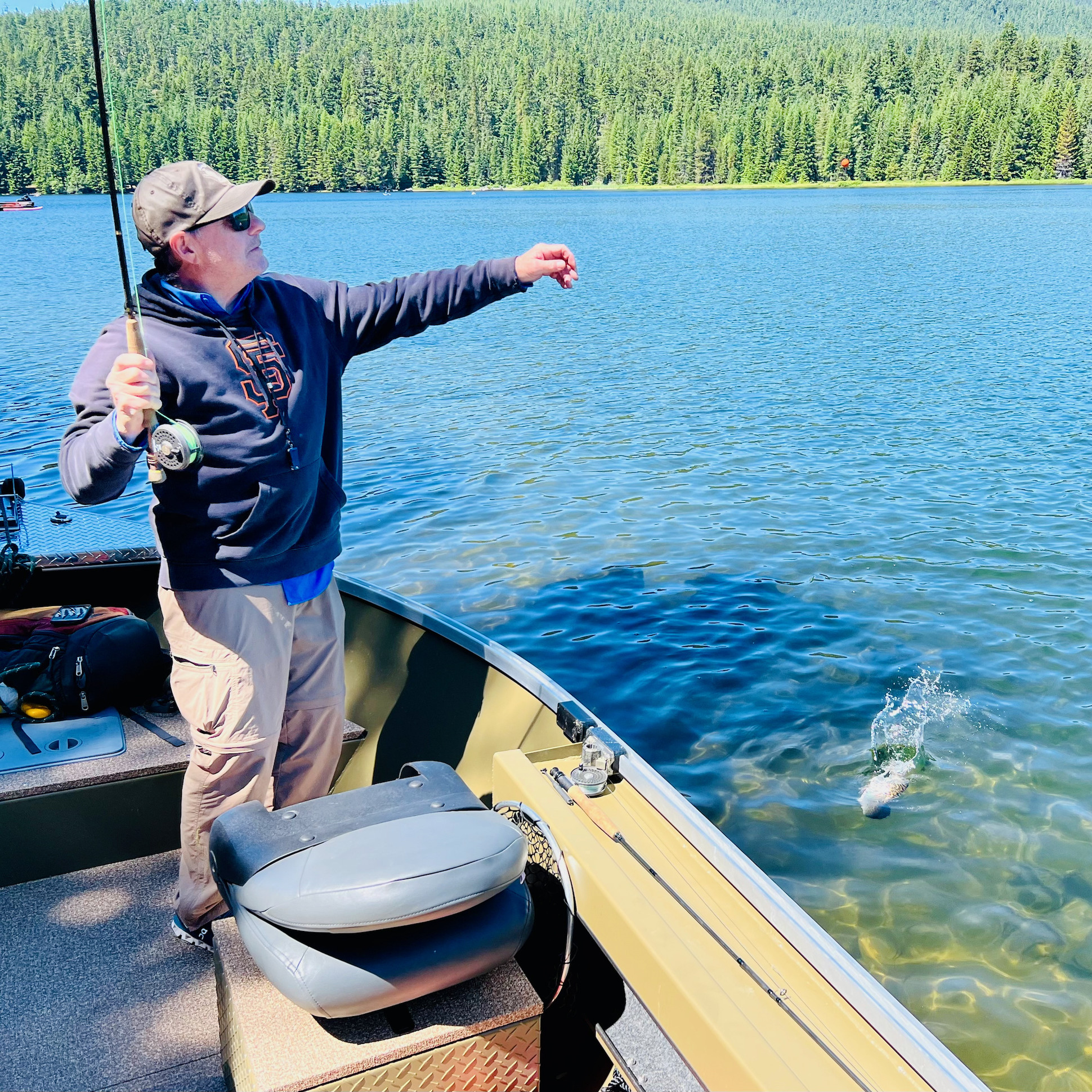 My stillwater fishing experiences have been mostly in the high Sierra lakes where the solitude and splendor are the main attraction. Taking in the surrounding beauty but brought back to the moment with a tug on the line and bringing a nice fish to hand. Fishing from a boat on Timothy was going to be something new and I was super stoked.