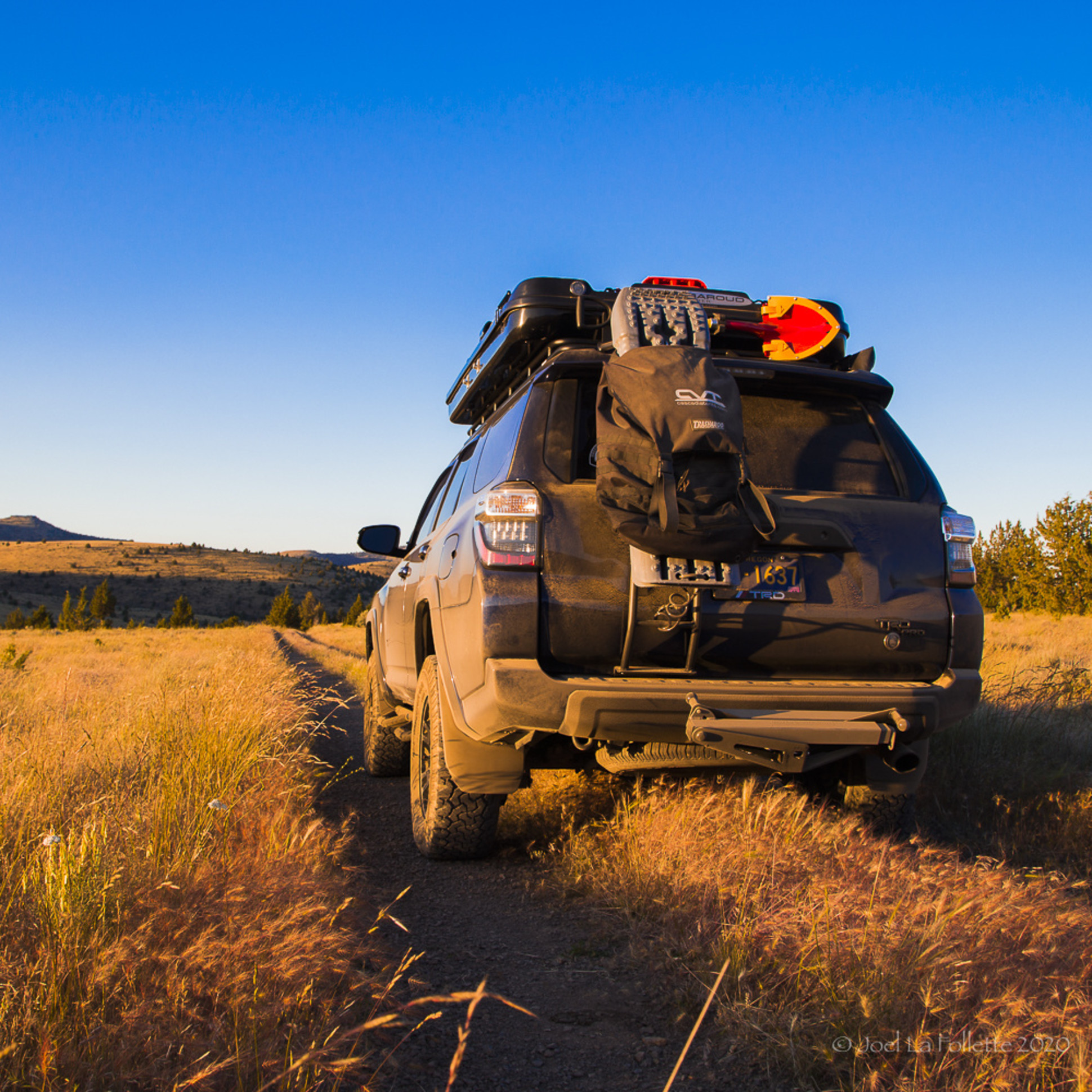 From Jennifer as Joel was driving “We departed the shop around noon and headed east- it took all the way to Rattlesnake Springs, just shy of the OR/ID boarder, to glimpse a sliver of blue sky and fill our lungs with something others then “hazardous” air quality. Pressing onward into Boise, the smoke thickened up again and prompted us to drive into the night to travel as far southeast as possible to shorten the following days journey. Navigating only by our on-board satellite system, we selected a primitive BLM location and crossed our fingers. Turning off HWY20 to trek 13 miles over an uninhabited desolate barren, the 4Runner high beams lit up the night to reveal all sorts of wildlife that crossed our path; 6 Pheasant hens, 5 scurrying mice, 4 slithering snakes, 3 stray cats, 2 wiley coyotes, 1 Mule Deer and a large fluffy Jackrabbit. The long dirt road amongst a sea of Sagebrush had been well maintained and clearly less traveled, which promised a ending possible of two outcomes, and fortunately, at the end of the road was a like-new, concrete palapa complete with a pit toilet and a level camping pad just waiting for our arrival. The ambient temperatures had dropped into the low 50’s; we knew with zero light or smoke pollution a crystal clear night sky would welcome us to dreamland and prepare us for the following days adventure into West Yellowstone.”