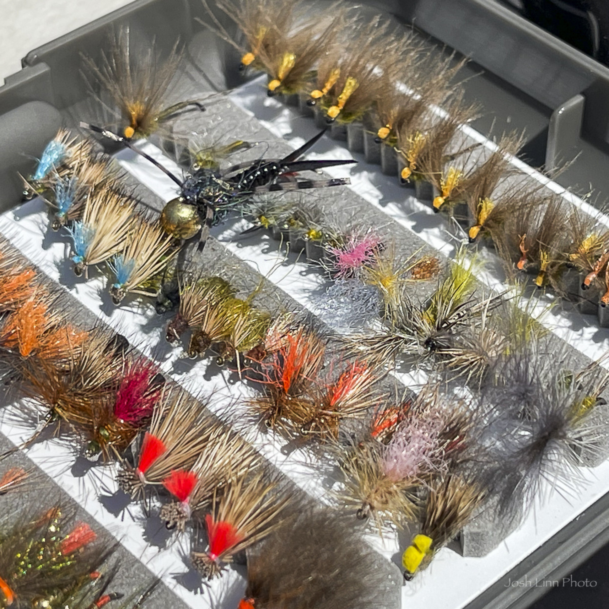 In the morning we fished dry dropper setups, a tan Caddis with a Caddis pupa as the dropper. When the sun got on the water we switched to the Euro nymph setup which was far and away the best. We fished all types of different weights so we could fish all depths of water. 3.8mm with a 3.2mm was a good combo for deeper faster water and in the shallow water, a 3.2mm with a 2.8mm was the ticket. Probably the best fish we caught all weekend was in about 15” of water on a green rock worm. Around 3:00 we started searching the back eddies for rising fish. In some spots, they were coming up really well, and in others not so much. But we did get a few on long 6x leaders with small Sz 18 and 20 blue-winged olive dries. If you stay till dark expect a Caddis hatch and some good dry fly fishing.