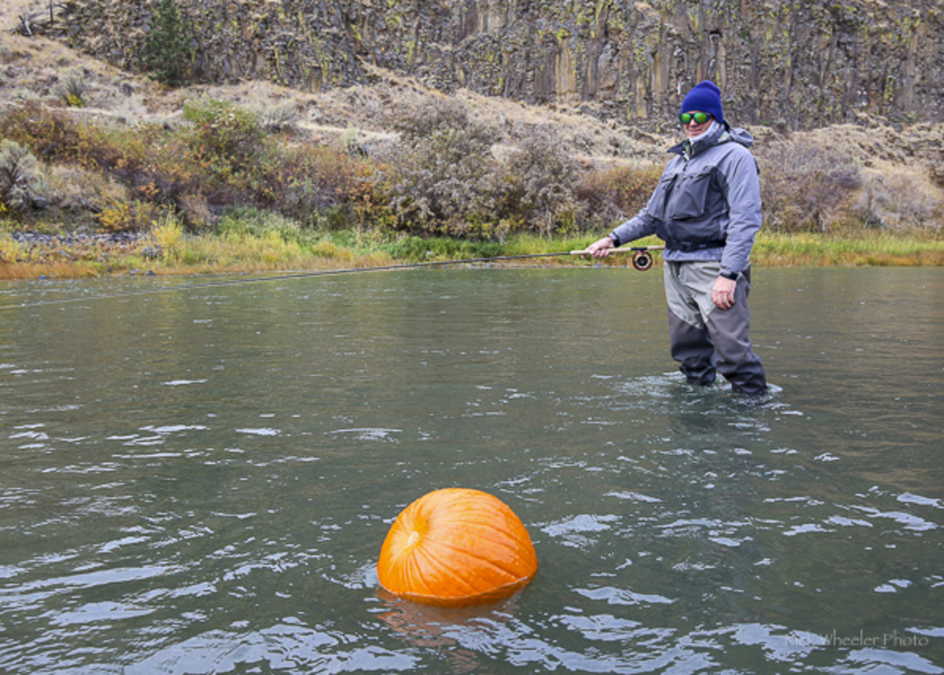 This last weekend I decided to head back to the east side with a couple of friends and because its the start of the holiday season and being in the spirit I invited Pumpkin Josh to join us. Being Josh, he jumped right in the boat no problem and soon became our guide. Pumpkin Josh helped with our fly choices and even waded a few runs alongside us. Kevin, one of the other guys on the float enjoyed the companionship, especially since regular Josh trash talks him on most tips. All-in-all our new guide put us in the best runs and we were able to bring three Steelhead to hand. This shows that fishing continues to be productive for Steelhead on the east-side streams. It is fall with winter knocking on the door, so make sure you pack several warm layers. Pumpkin Josh isn’t booking any trips at the moment, we’re still having trouble with the Marine Board giving a pumpkin a guide license, but we have lots of wonderful humans that will gladly take you out, just check the Guide Shack on our website.