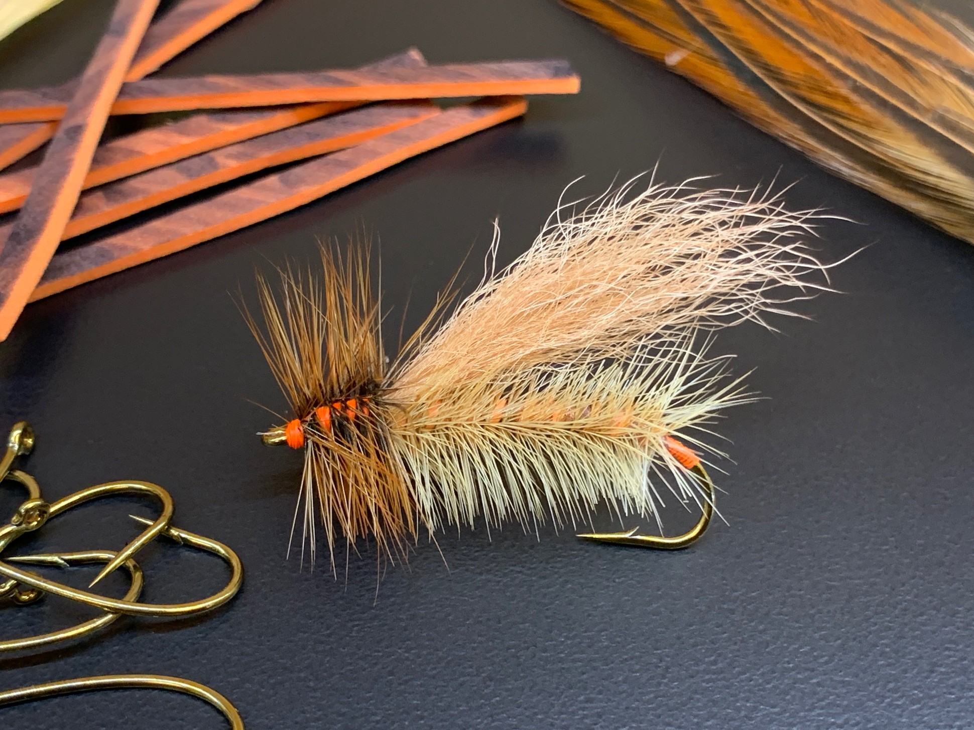 As the years went on, the fly that I tied evolved, the body, instead of dubbing, became a strip of foam colored black wrapped up the hook, ginger saddle hackle was palmered up the body with as many wraps as possible to increase floatation.