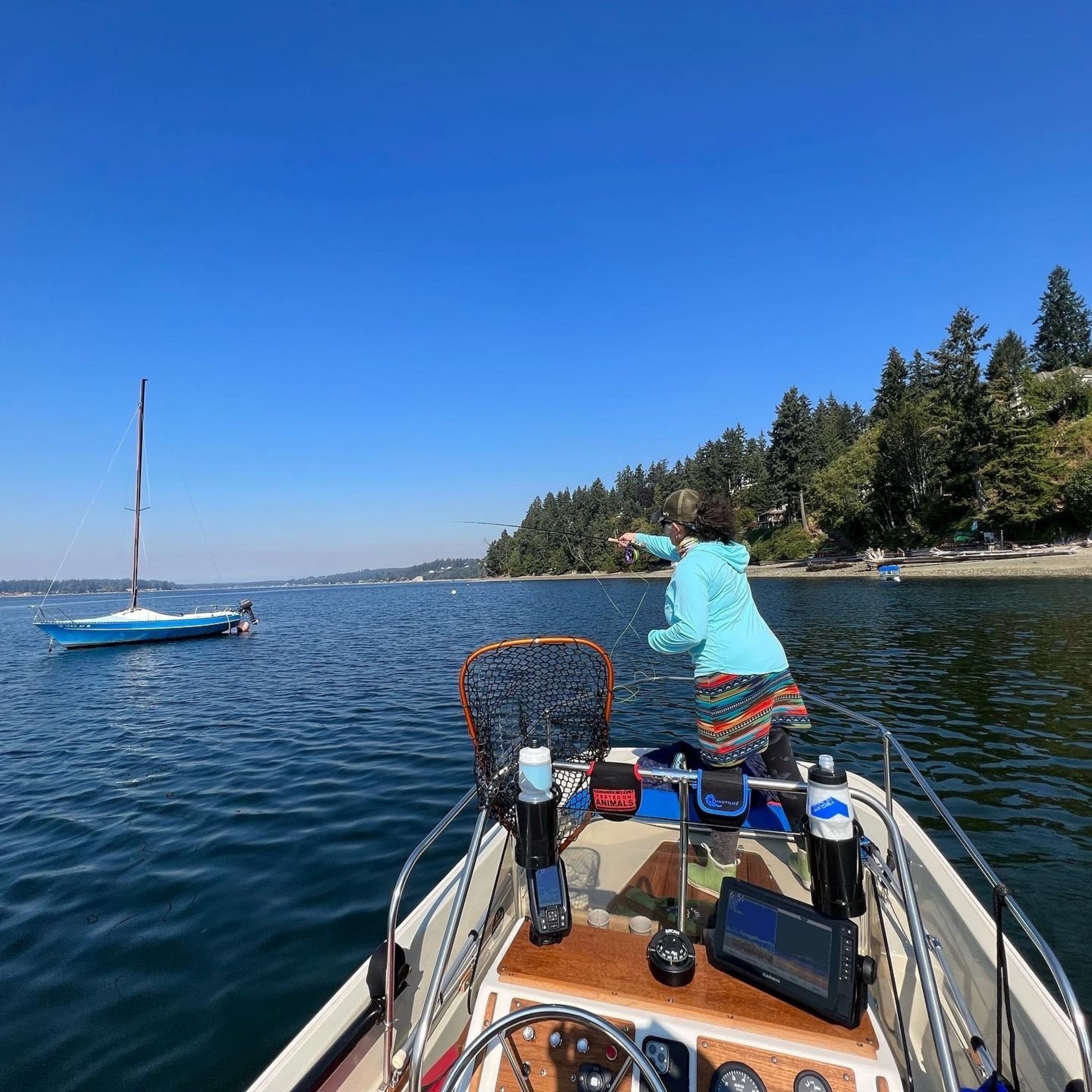 Farther north, Puget Sound entertained Jennifer and me for a few days of Searun Cutthroat and Coho fishing. We are still learning this fishery, and thanks to my friend, Blake Merwin, at the Gig Harbor Fly Shop, and my Scott Fly Rod rep, Dan Marshall, we are slowly making progress. It's safe to say I love saltwater fly fishing, and exploring the bays and inlets of Puget Sound in itself is a pleasure for me, but add feisty Cutthroat, resident Coho, Blackmouth, and adult Coho to the adventure, and it's hard to come home. I will not even pretend to have all the answers for this fishery, but over the coming years, we'll have fun trying to figure it out. A mix of weather, including winds to 20mph from the SW, made Thursday challenging, to say the least, but dinner on the bow deck of the Lyla, then heading back out as the evening breeze settled down, made for a memorable evening to finish off our angling vacation. You don't need a boat to enjoy this fishery or stay on the Lyla. Feel free to hit me up for details.