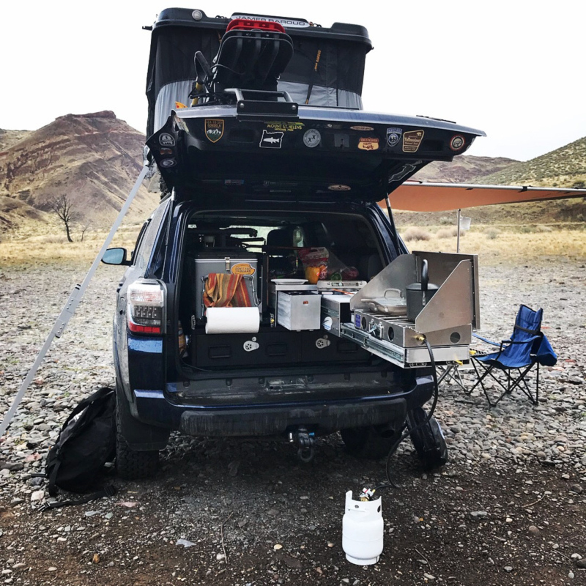 Extended stays in Central Oregon required cooking and sleeping options, so a kitchen was added to facilitate those requirements, while a makeshift bunk kept me dry inside during overnight rain. Fishing trips refined the kit, but soon I discovered I didn't fold as easily at the age printed on my passport, so a rooftop tent was added. Sleeping above the ground away from the creatures of the night proved to be very relaxing and extremely comfortable, making more extended expeditions enjoyable.
