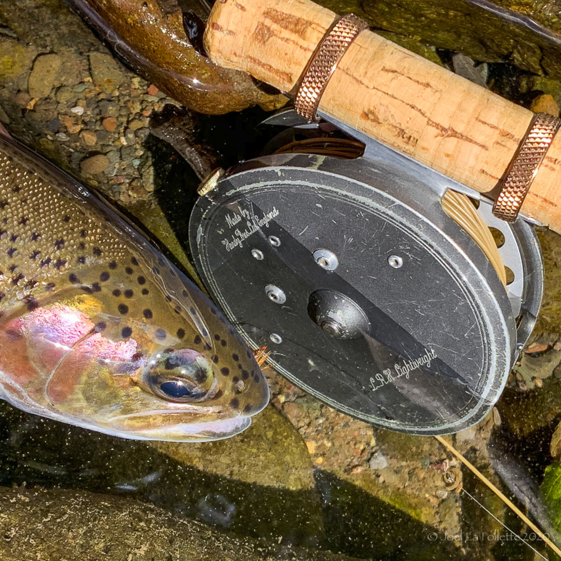 The fly selection worked perfectly; on the second cast, the fish rose and took the fly racing down the pool's length. The fiber wand bent hard while the old Hardy sang. Nervously, I worked the fish to hand, then leaving him to rest in the shallows, a quick photograph and release. This was a memorable trophy found hiding beneath the bubbles in this crystal clear stream.